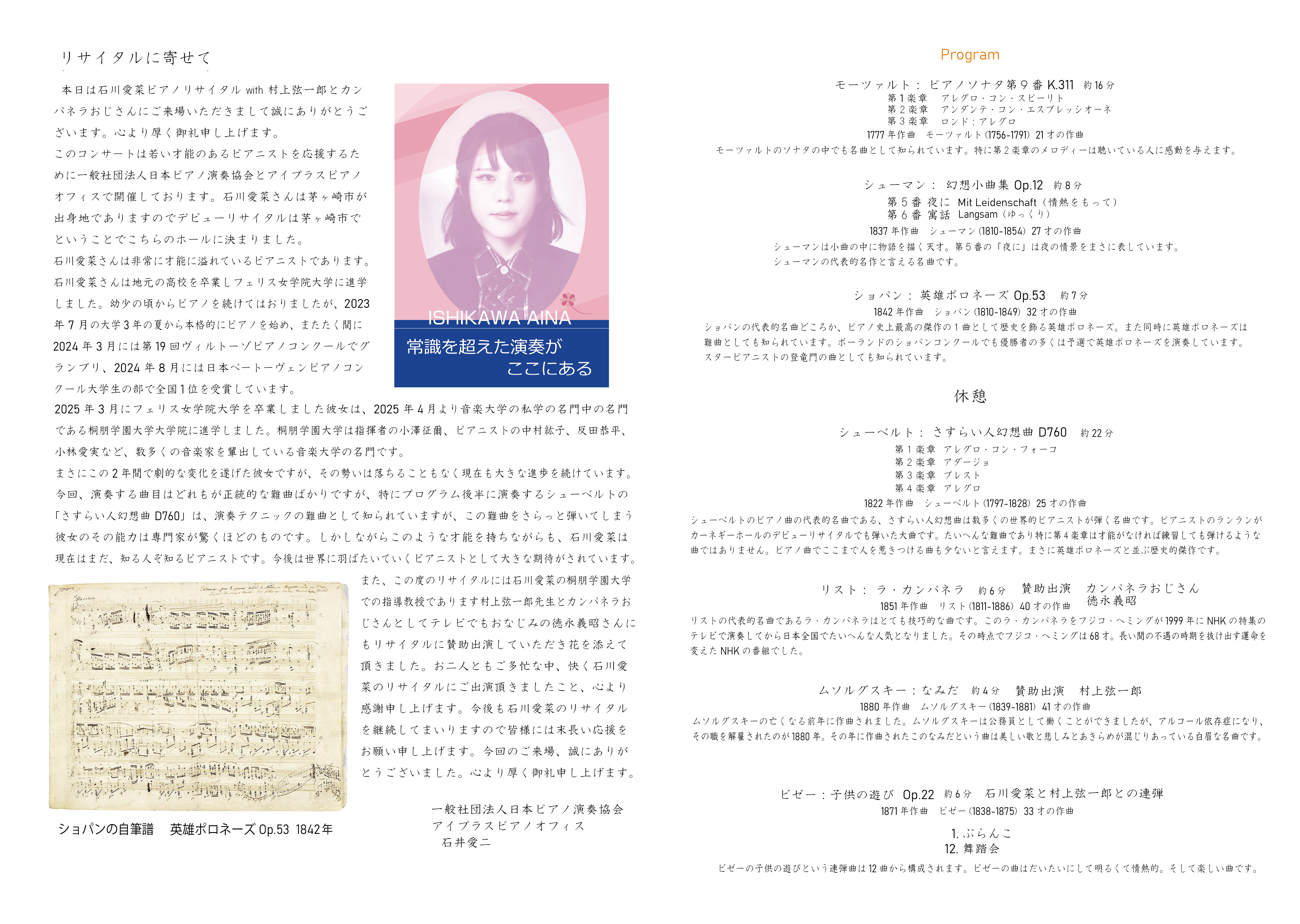ほんとうに充実したプログラムで素晴らしいデビューリサイタルをありがとうございました まず何をおいても、石川愛菜さんの英雄が私の最も好きな英雄であることに今日あらためて確信をもてましたことを、勝手ではありますがほんとうに嬉しく思います 生演奏から語り尽くせないものをみなとみらいで感じて以来今日再び三たび ですから、本当に贅沢なくらいにパワーを頂けましたことを実感しております さすらい人幻想曲もとっても心が震えました あまりそのようには感じさせないけれども、相当難曲なのではないでしょうか モーツァルトもシューマンも石川さんが弾いてくださるととっても表現が豊かで、ピアノをそれほど詳しくない私でも確かに石川 さんの曲だとわかるような気がします また全編で渾身で魂心の演奏をみせてくださるのがこの上ない魅力なのですが、日頃鍛えていらっしゃるのでしょうか…と心配になるほどの躍動感です そして、今日はプログラムのプロフィールを拝見して驚いてしまいました そんな石川さんはピアノを本格的に始めてまだ2年たったばかりとは 、それは大変なインパクトです もし機会がありましたら、2年前にどのようなきっかけがあったのか、またそれまではどのような将来像を描いてらしたのか、について語って頂けますと嬉しいです 長々と申し訳ありません これからのご活動を心から楽しみにして、応援させて頂けましたら幸いです